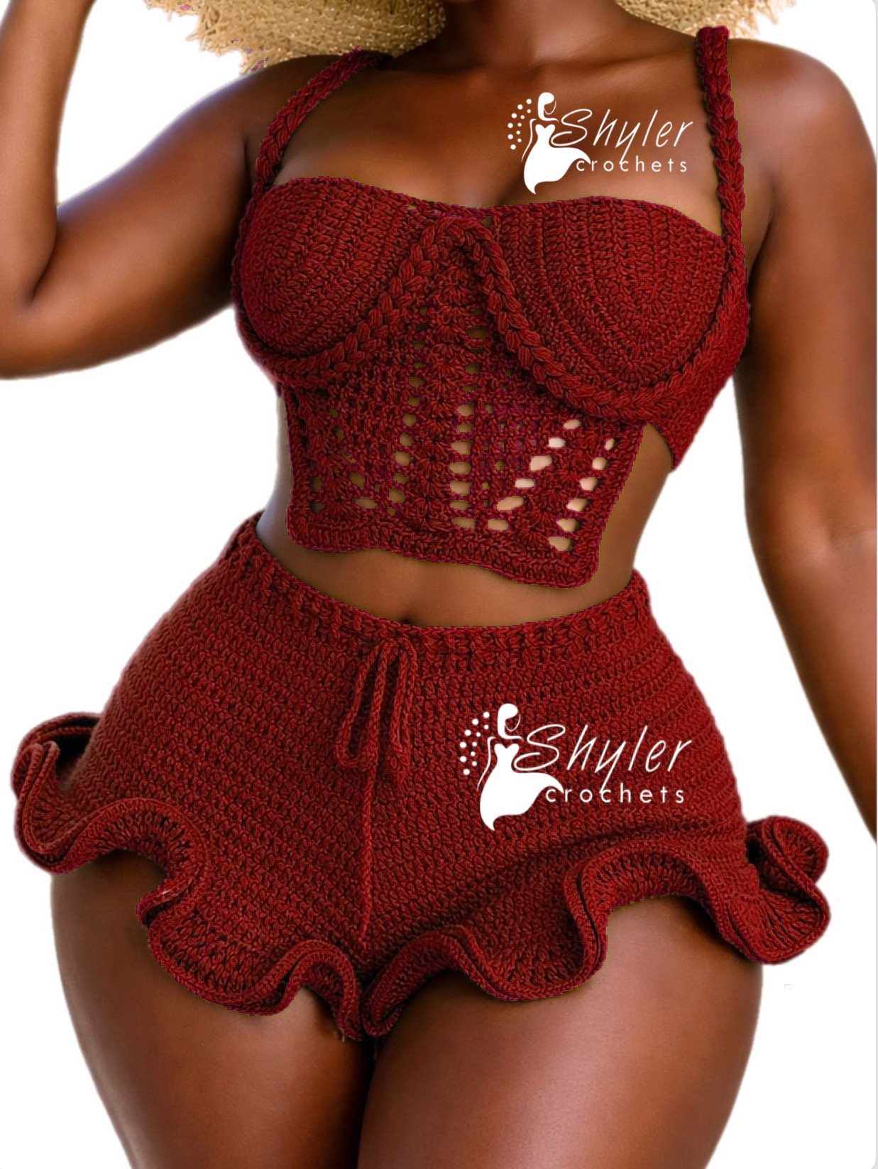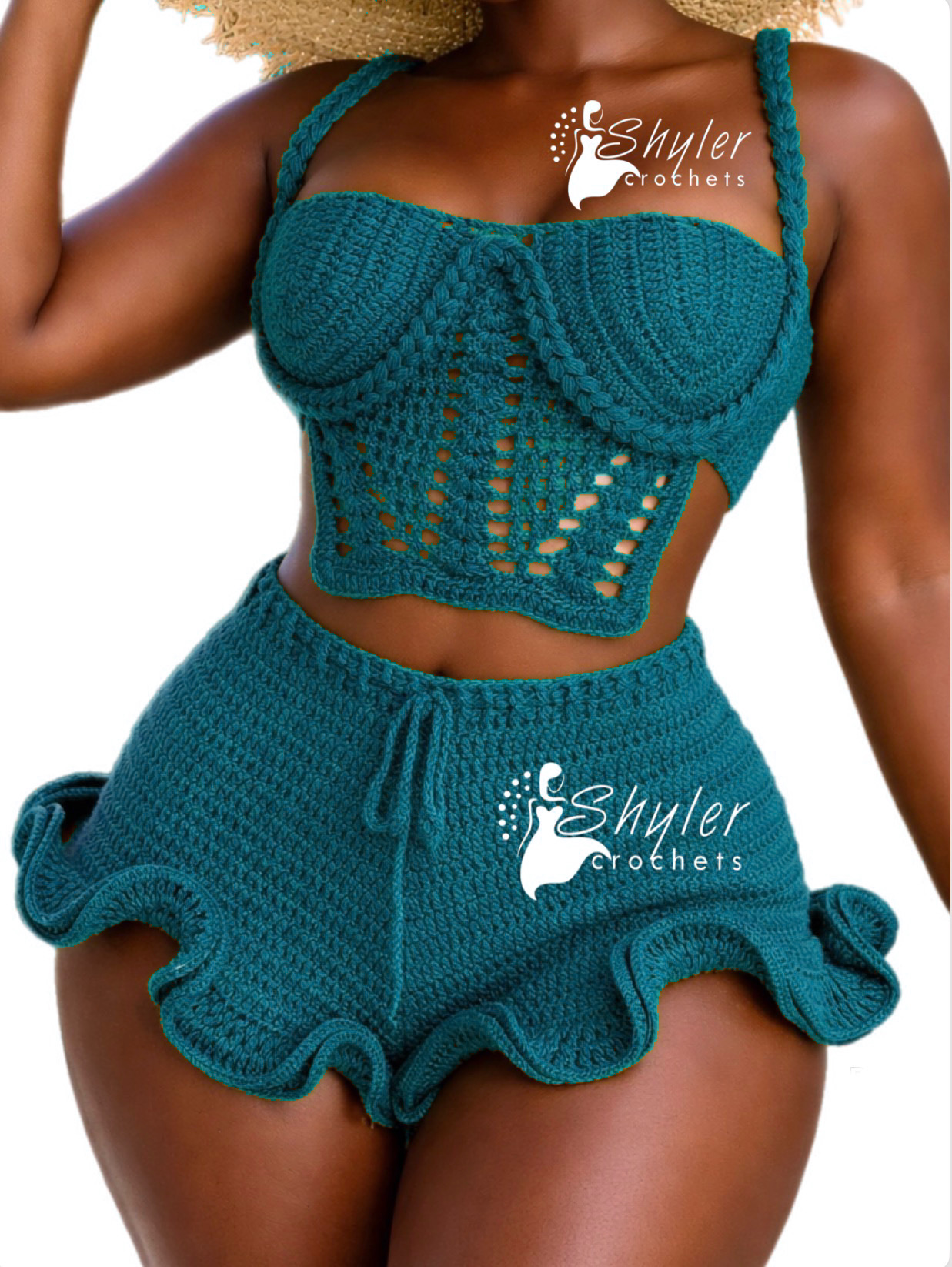 Meet your new favorite warm-weather outfit: the Ruffle Crochet Summer Shorts paired with the Braided Rope Crochet Top by ShylerCrochets. This charming handmade set blends comfort, texture, and effortless style, making it perfect for sunny days, beach outings, or relaxed weekend looks.